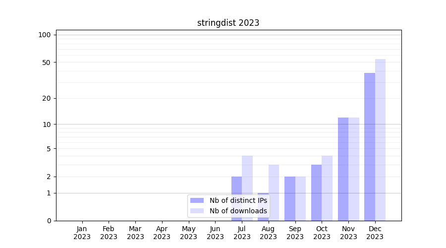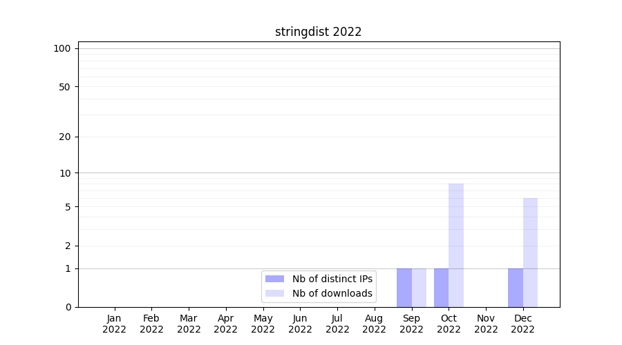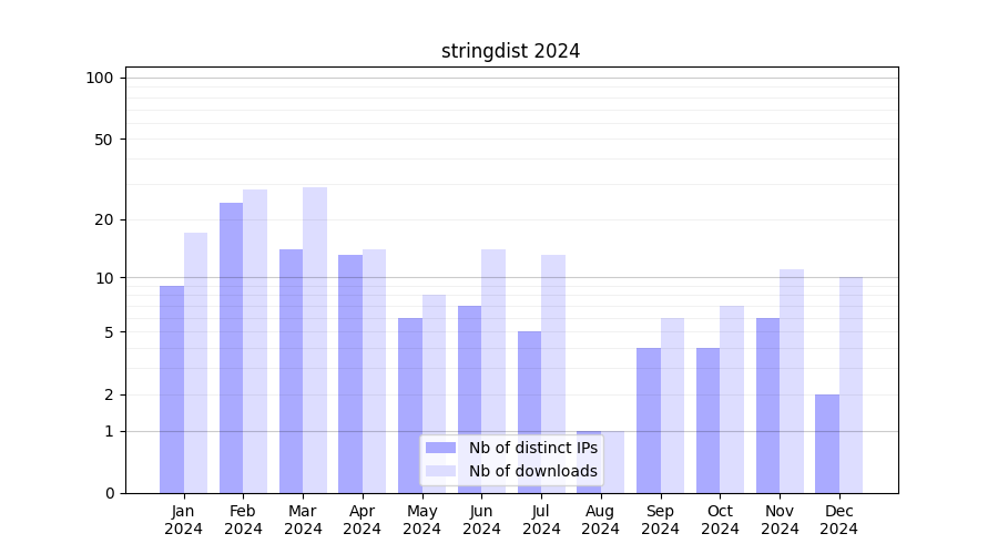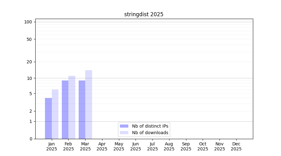 Number of downloads for workflow package stringdist, year by year, from 2025 back to 2015 (years with no downloads are omitted):