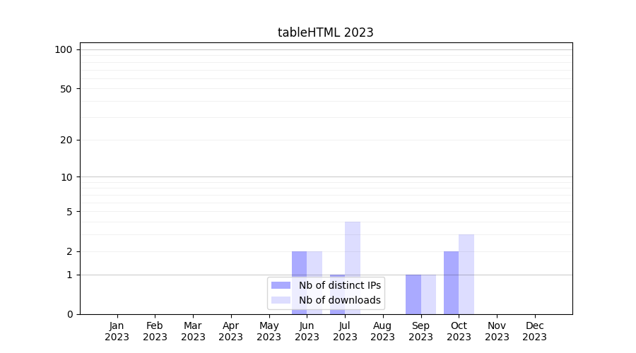Number of downloads for workflow package tableHTML, year by year, from 2025 back to 2015 (years with no downloads are omitted):