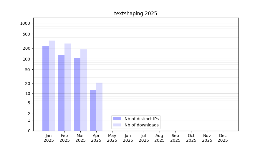 Number of downloads for workflow package textshaping, year by year, from 2025 back to 2015 (years with no downloads are omitted):