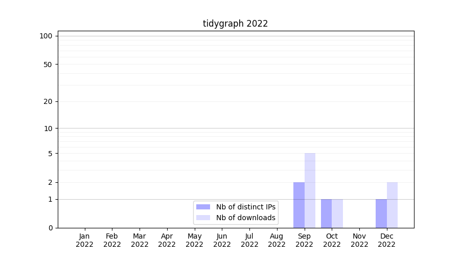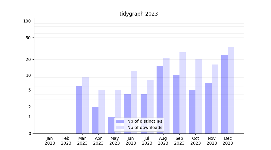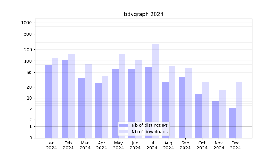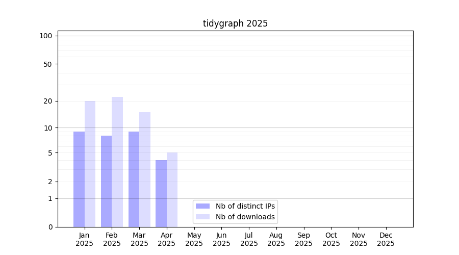 Number of downloads for workflow package tidygraph, year by year, from 2025 back to 2015 (years with no downloads are omitted):