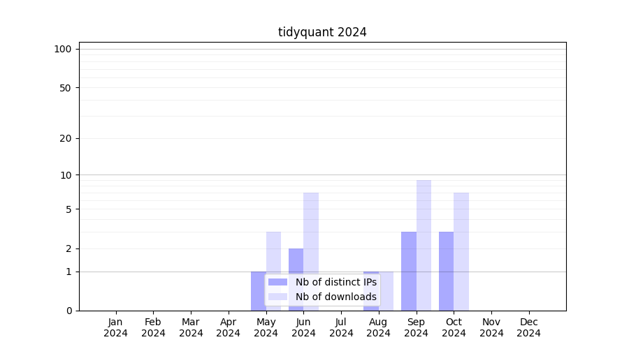 Number of downloads for workflow package tidyquant, year by year, from 2025 back to 2015 (years with no downloads are omitted):