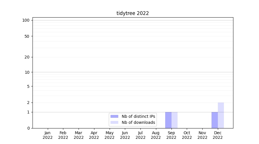 Number of downloads for workflow package tidytree, year by year, from 2025 back to 2015 (years with no downloads are omitted):