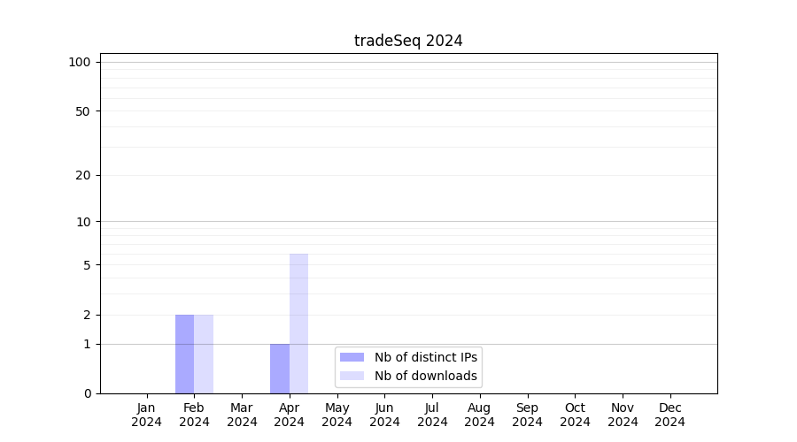Number of downloads for workflow package tradeSeq, year by year, from 2025 back to 2015 (years with no downloads are omitted):