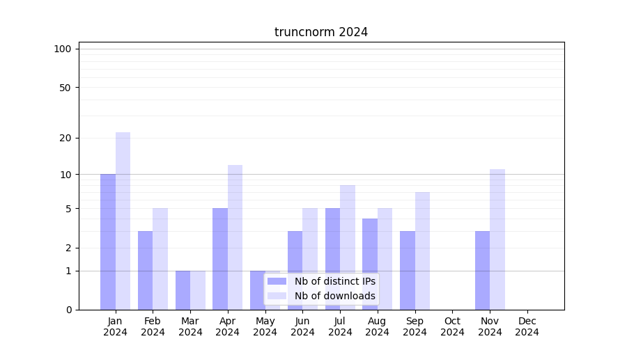 Number of downloads for workflow package truncnorm, year by year, from 2025 back to 2015 (years with no downloads are omitted):