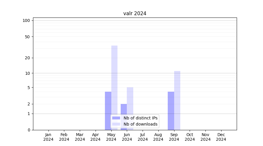 Number of downloads for workflow package valr, year by year, from 2025 back to 2015 (years with no downloads are omitted):