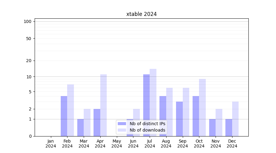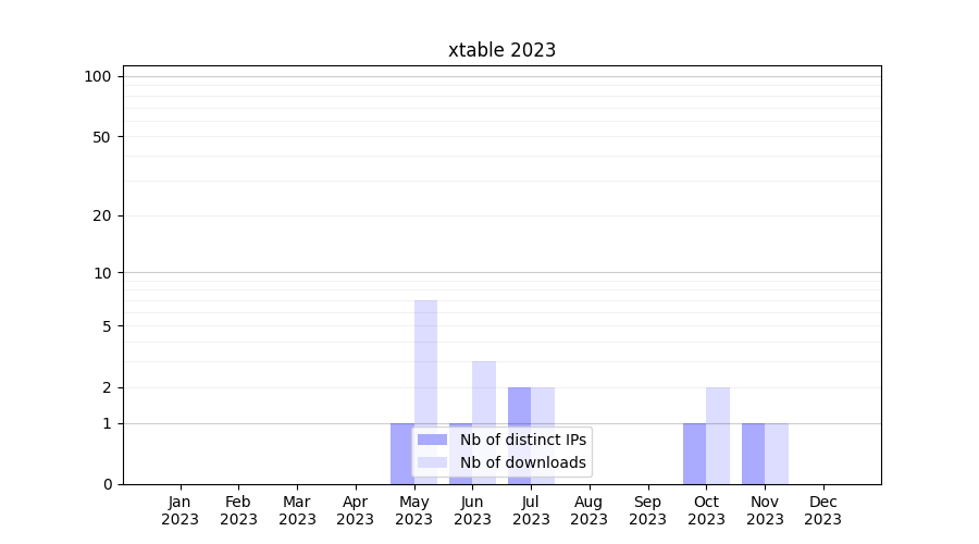 Number of downloads for workflow package xtable, year by year, from 2025 back to 2015 (years with no downloads are omitted):