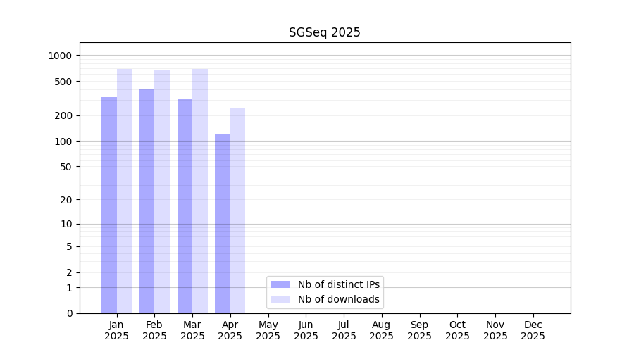 Number of downloads for software package SGSeq, year by year, from 2025 back to 2014 (years with no downloads are omitted):