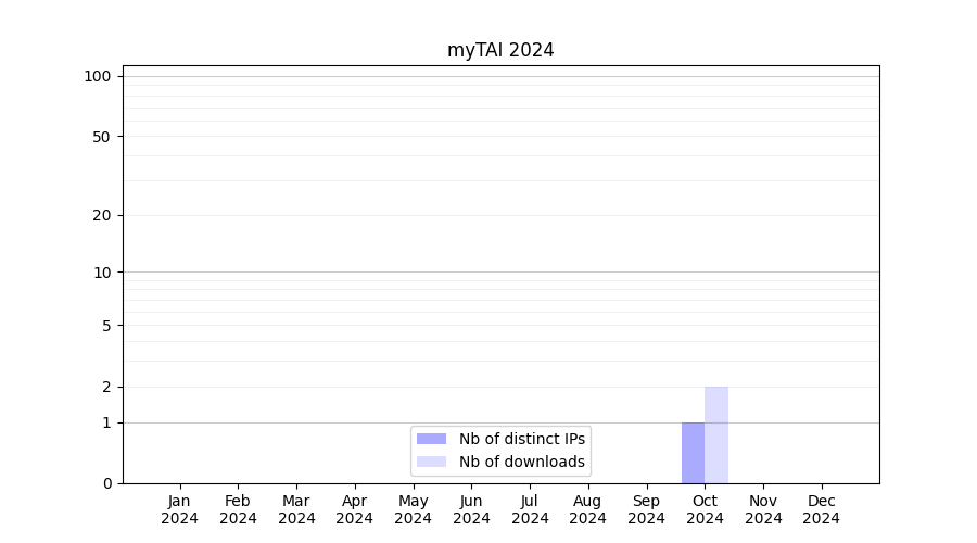 Number of downloads for software package myTAI, year by year, from 2025 back to 2014 (years with no downloads are omitted):