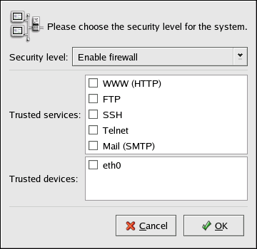 The options selected are also written to the /etc/sysconfig/redhat-config-securitylevel file so that the setting can be restored the next time the application is started. Do not edit this file by hand.