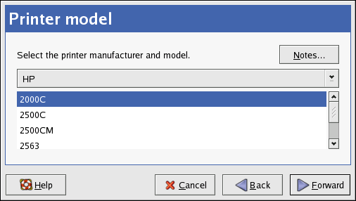 You will see a window similar to Figure 36-10. If it was not auto-detected, select the model from the list. The printers are divided by manufacturers. Select the name of the printer manufacturer from the pulldown menu. The printer models are updated each time a different manufacturer is selected. Select the printer model from the list.